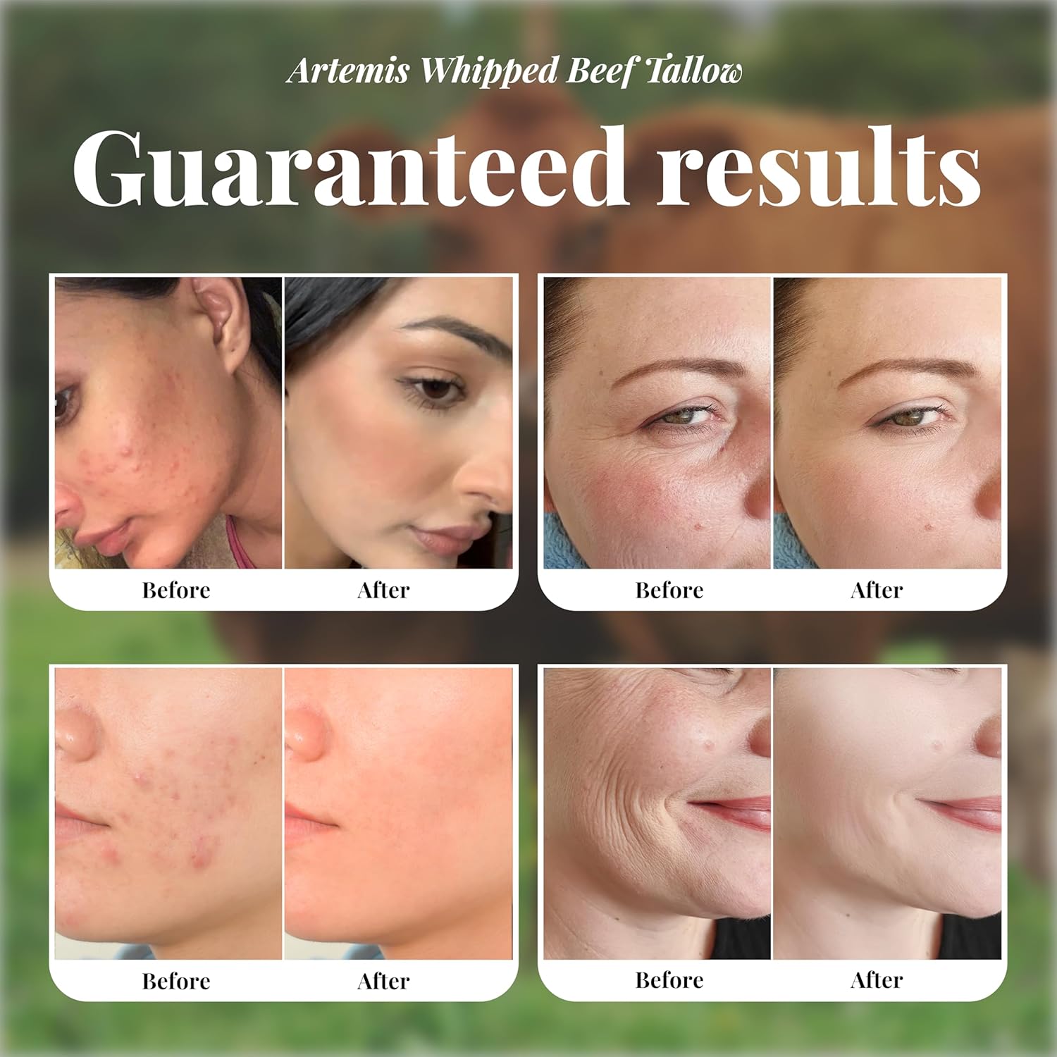 Artemis Whipped Beef Tallow Balm helps to deeply hydrate, restore skin elasticity, reduce the appearance of wrinkles and fine lines, and promote cell regeneration. Additionally, its antioxidants, such as vitamins A, C, D, and E, help combat signs of aging and improve skin appearance.